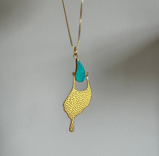 Turquoise Hammered Gold Necklace | Stone and Gold Pendant | 18K Gold Plated