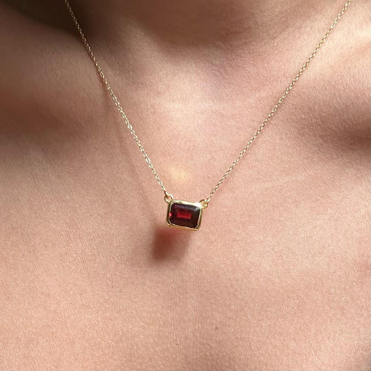 Red Garnet Emerald Cut Necklace | Rectangle Pendant | 18K Gold Plated