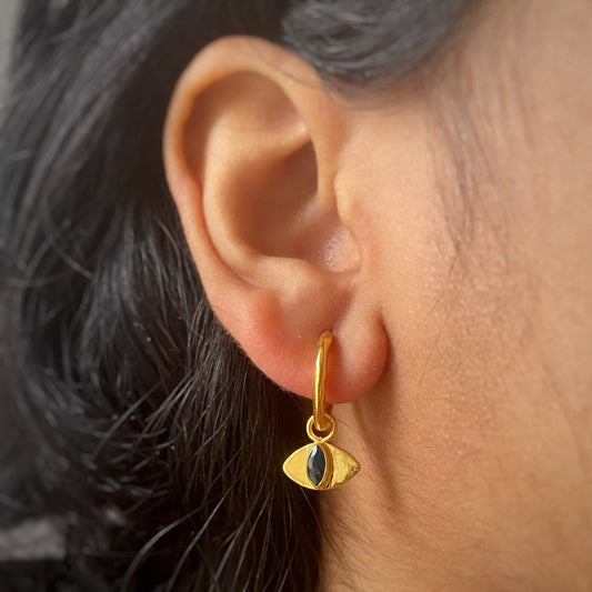 Evil Eye Black Sapphire Earrings | 18k Gold Plated | Huggie Hoop Earrings