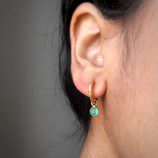 Green Onyx Round Charms Earrings | 18k Gold Plated | Huggie Hoop Earrings